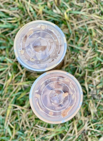 With an Iced Blackberry Latte and an Iced Blackberry Lavender Latte, both with Oat Milk.